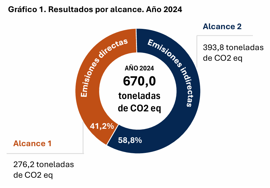 La mayor parte (59%) correspondió a emisiones indirectas derivadas del consumo de energía eléctrica, mientras que el 41% restante se originó en emisiones directas asociadas a la climatización (principalmente por fugas de gases refrigerantes de los equipos de aire acondicionado) y al uso de gas natural y transporte institucional.